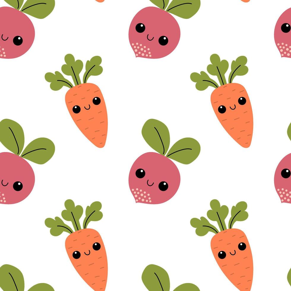 Seamless pattern with carrot and radish. Cute smiling veggies pattern. Pro Vector