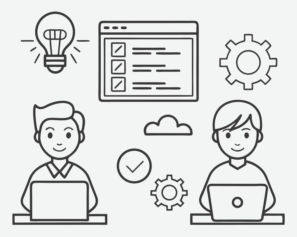 Team of developers working together with digital icons representing tasks and problem solving Pro Vector
