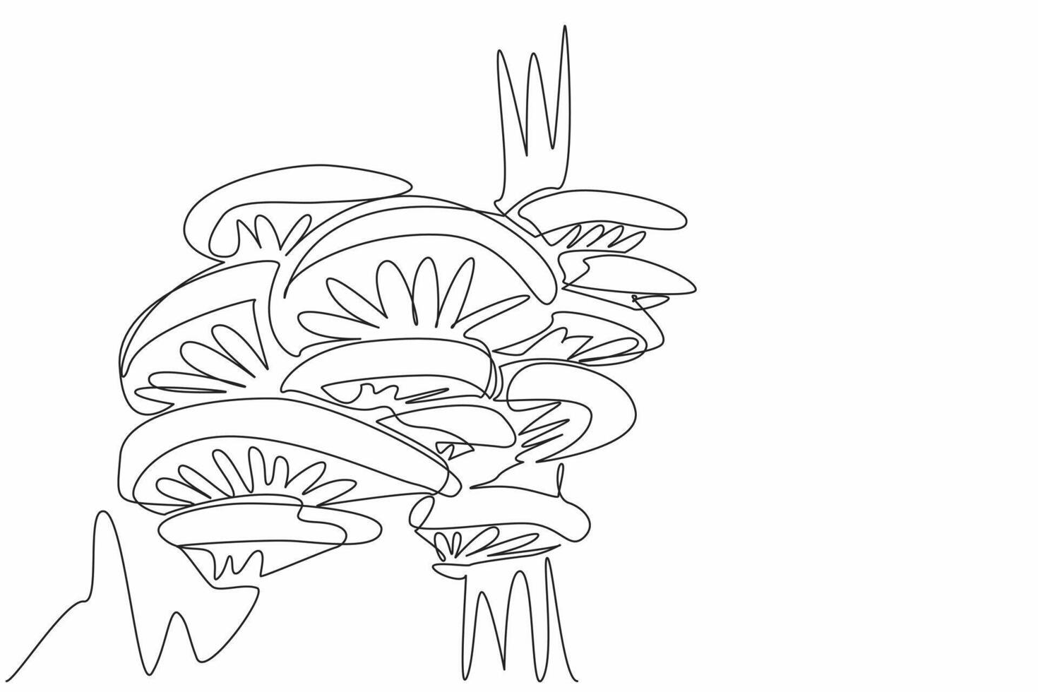 Single one line drawing oyster mushroom on a large tree trunk. Mushrooms with many benefits. Maintain heart health. Easy cultivation. Day of the Mushroom design graphic. Continuous line illustration Pro Vector