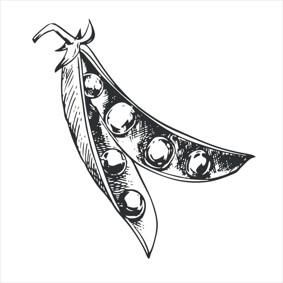 sketch of an open green pea pod. Bean pod, seeds visible. Imitation of engraving technique. Useful vegetable crop. Peas are hand-drawn with black ink on a white background. Pro Vector