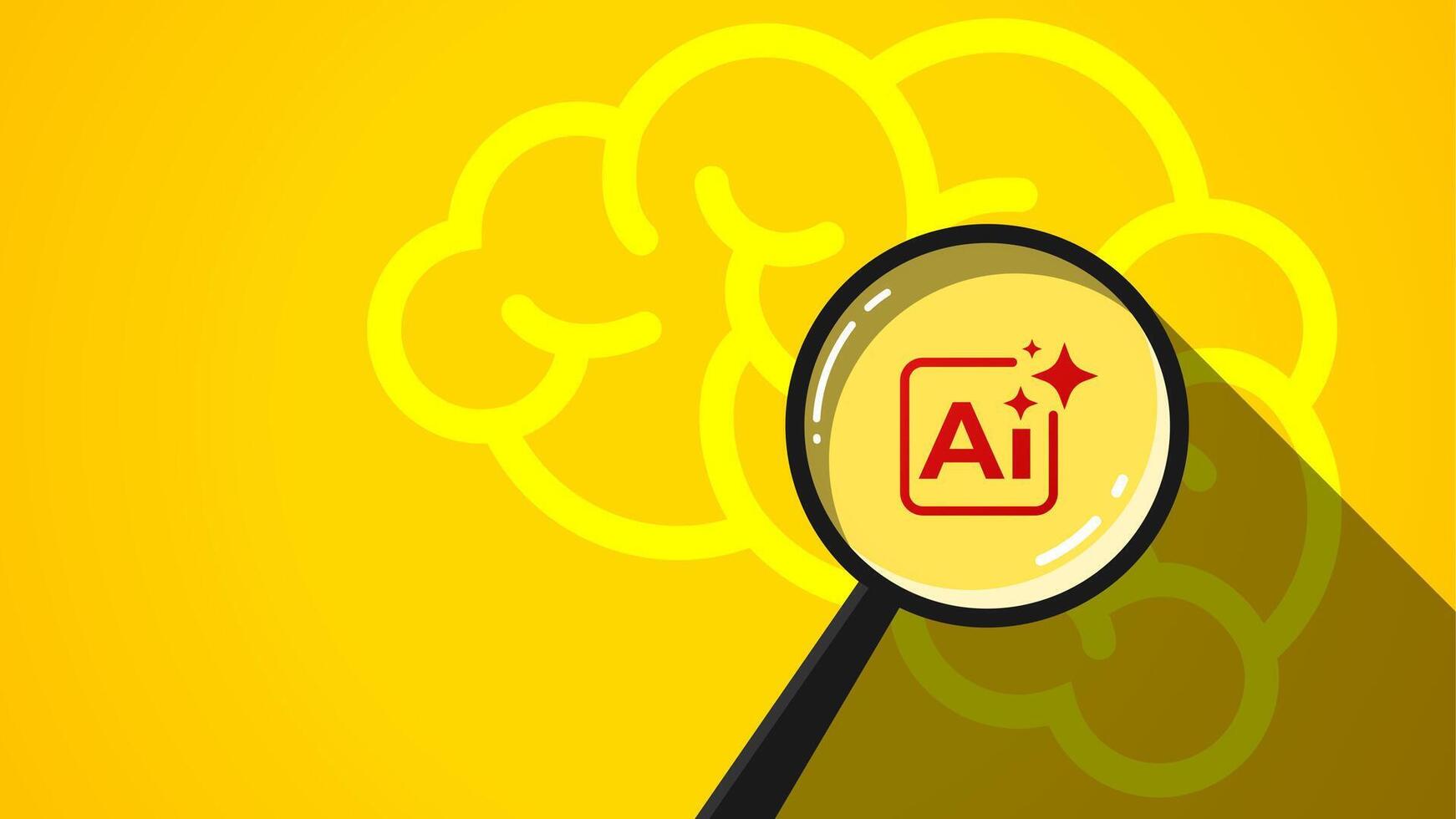 Flat illustration of a magnifying glass and an AI chip with a brain on a yellow background. The concept of the role of an artificial intelligence assistant Pro Vector