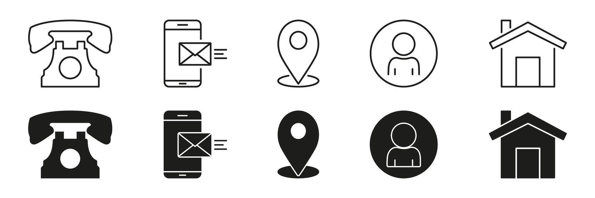 Communication And Location Icon Set. Contact Methods, Messaging, And Navigation Symbol Collection. Includes Phone, Mobile, Email, Location, User, And Home Icons. Isolated Illustration Pro Vector