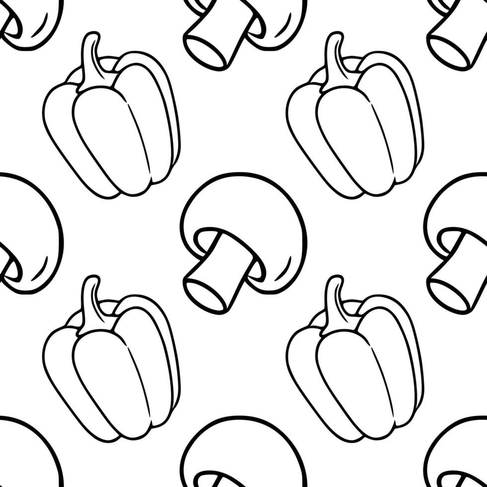 Seamless outline pattern featuring handdrawn illustrations of bell peppers and mushrooms, creating a minimalist monochrome design ideal for kitchenthemed projects. Pro Vector