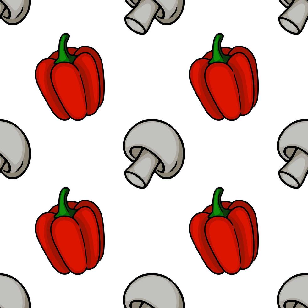 Seamless pattern featuring handdrawn illustrations of red bell peppers and gray mushrooms, creating a vibrant and playful kitchenthemed design. Pro Vector