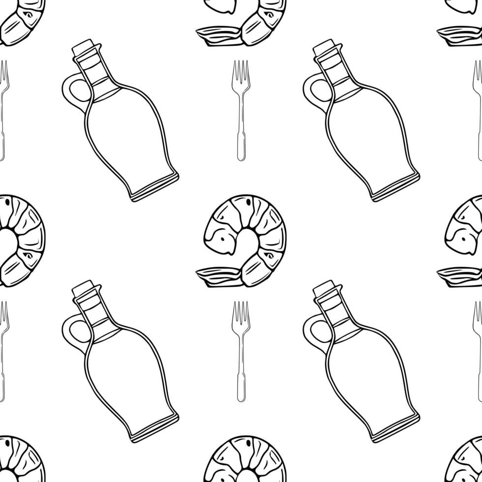 Seamless outline pattern featuring handdrawn illustrations of grilled shrimp, olive oil bottle, and fork, creating a minimalist culinary design. Pro Vector