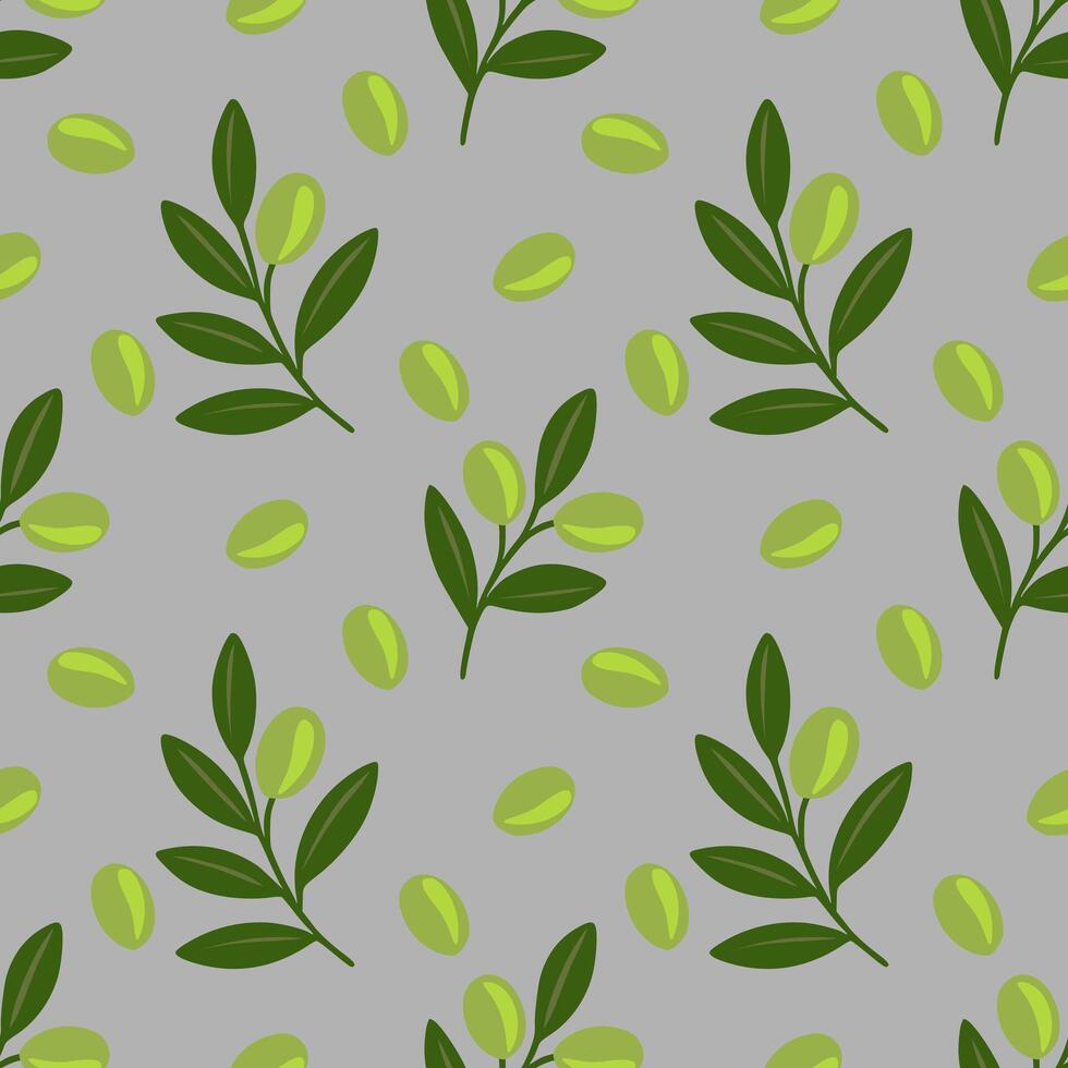 Seamless pattern of stylized olive branches and olives on a grey background, creating a fresh and natural design. Pro Vector