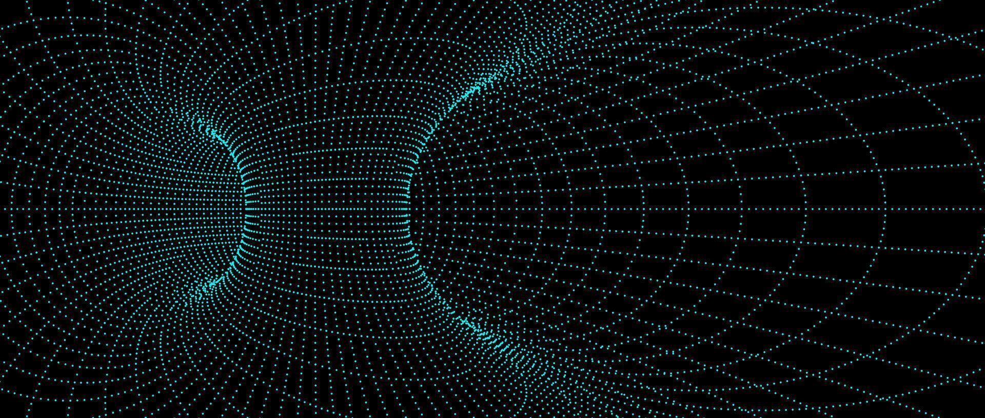 Wormhole wireframe structure. Neon geometric dotted outline grid tunnel backdrop. 3D funnel or vortex texture. Blue dashed abstract energy lines on dark background. Illustration wallpaper Pro Vector