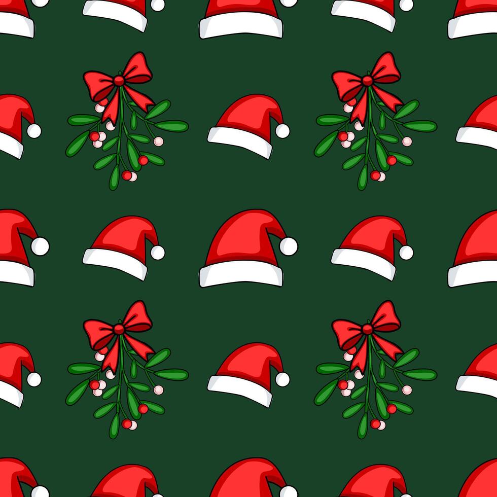 Seamless pattern featuring whimsical Santa hats and mistletoe sprigs with bows, set against a deep green background, creating a festive and playful Christmas design. Pro Vector