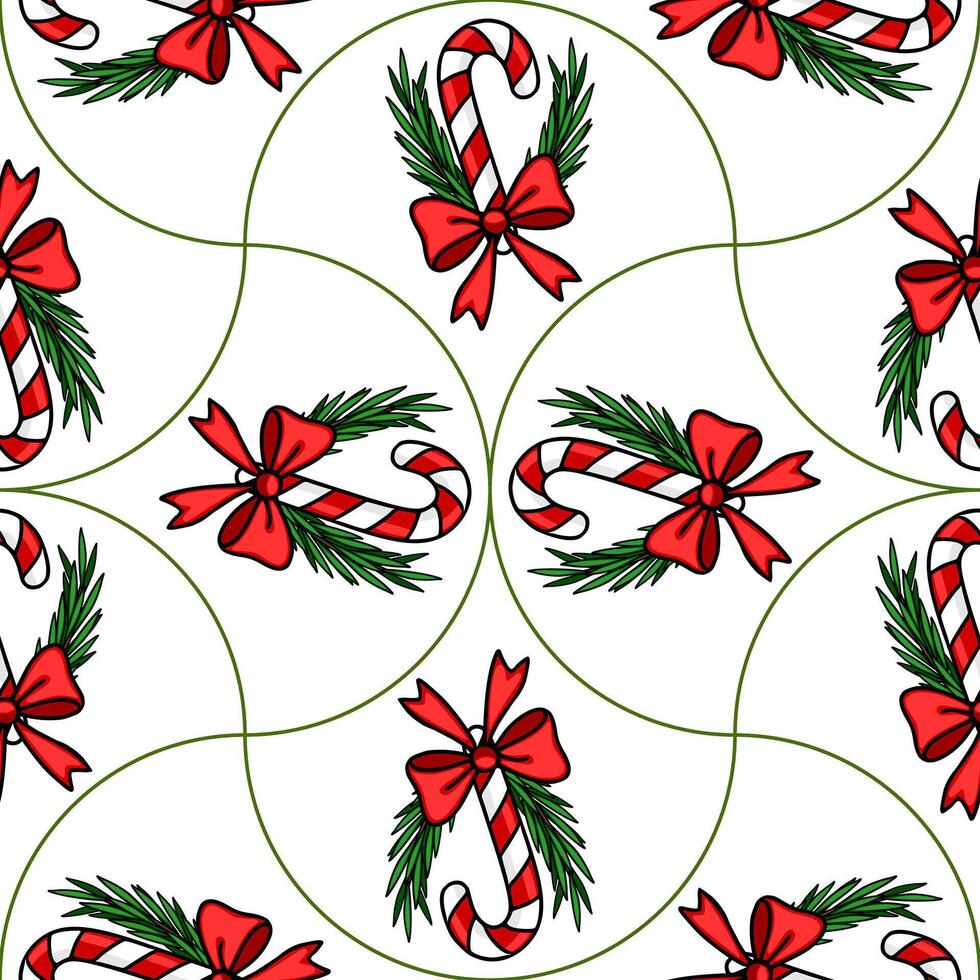 Seamless pattern of Christmas candy canes adorned with red bows and fir branches, arranged in a unique, repeating design on a white background. Pro Vector