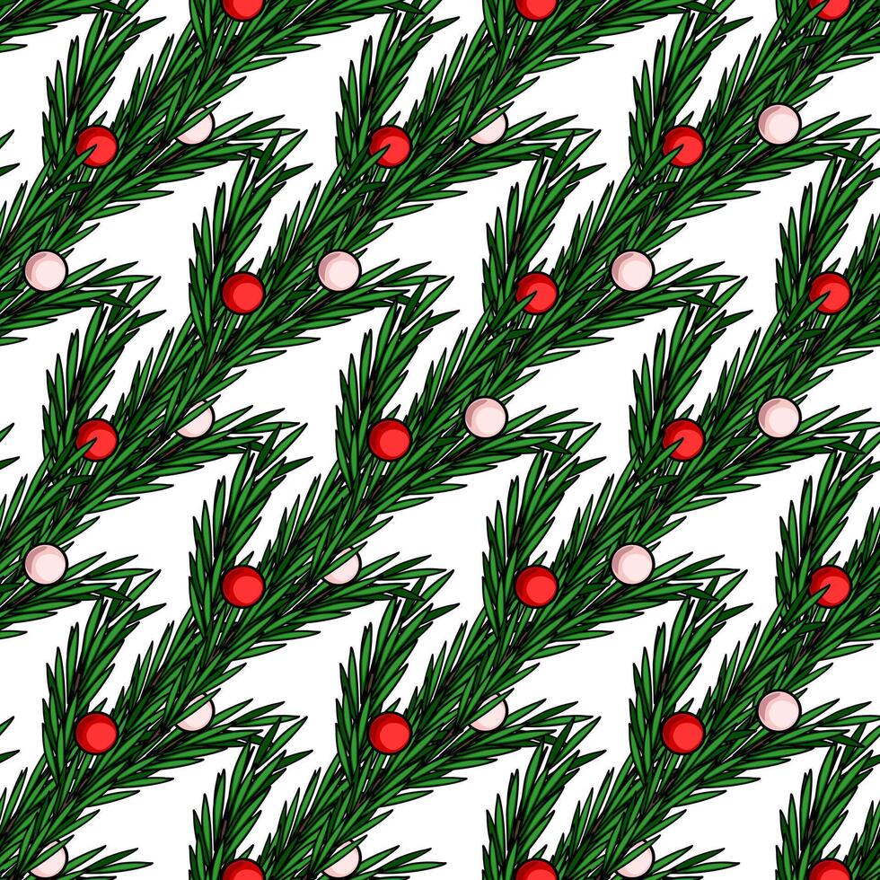 Seamless Christmas pattern with stylized pine branches adorned with red and pink baubles, creating a festive and elegant design ideal for winter holidays. Pro Vector
