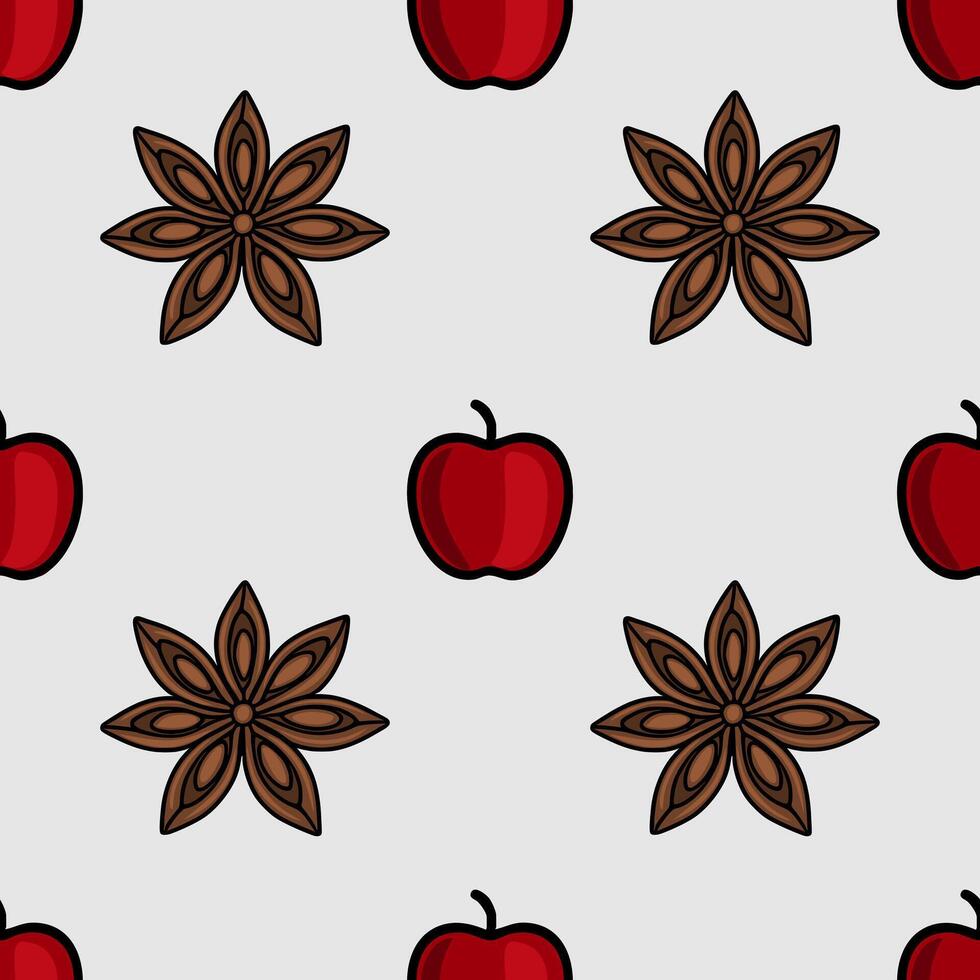 Seamless pattern featuring stylized red apples and brown anise stars on a light gray background, ideal for autumnal or Christmas designs. Pro Vector