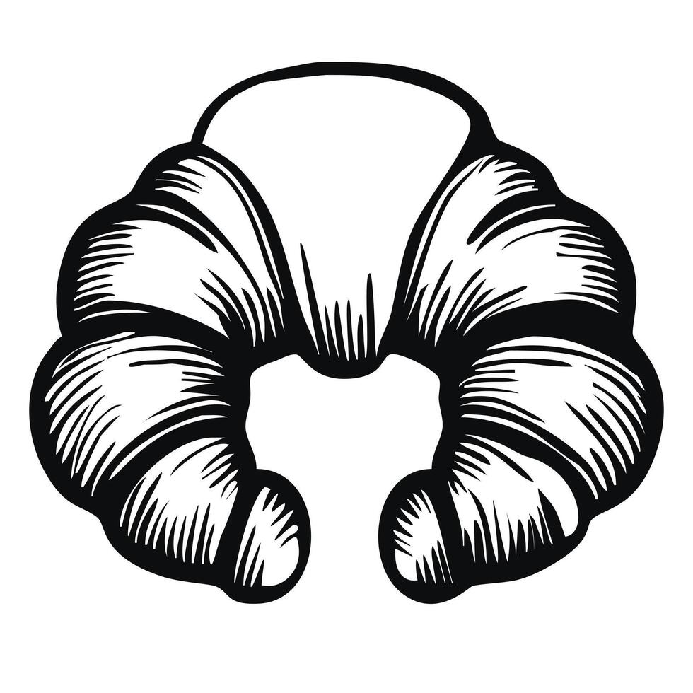 A handdrawn illustration of a croissant, showcasing its flaky layers and curved shape. The design emphasizes the texture and folds of the pastry, making it visually appealing. Pro Vector