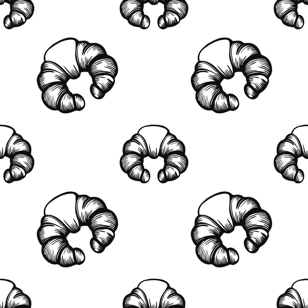 A seamless pattern of handdrawn croissants on a white background, showcasing the flaky texture and curved shape of the pastry. Pro Vector