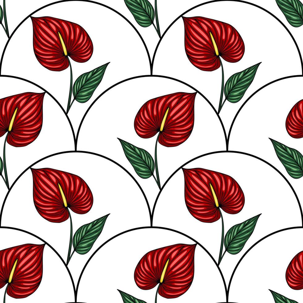 Seamless pattern with stylized red Anthurium flowers and green leaves arranged in a unique arc-shaped composition on a white background, creating a vibrant and elegant design. Pro Vector