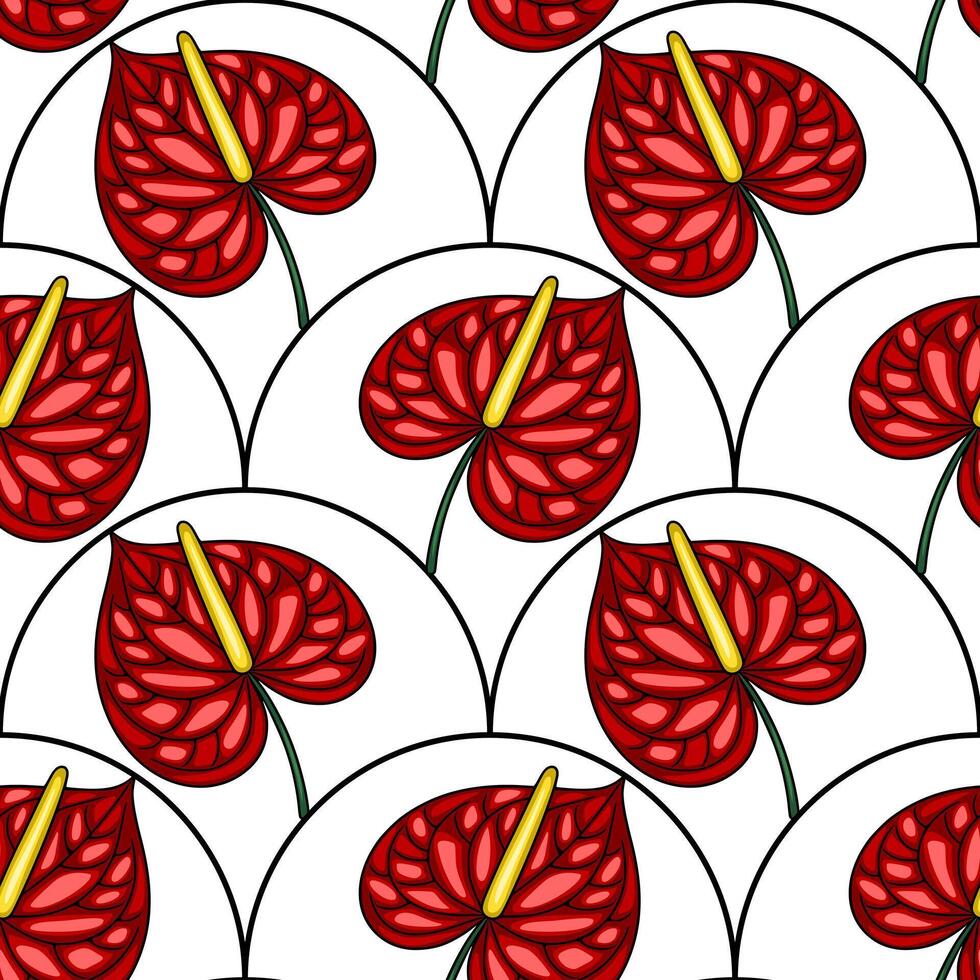 Seamless pattern of vibrant red Anthurium flowers arranged in a unique, wave-like pattern on a white background, creating a bold and stylish design. Pro Vector