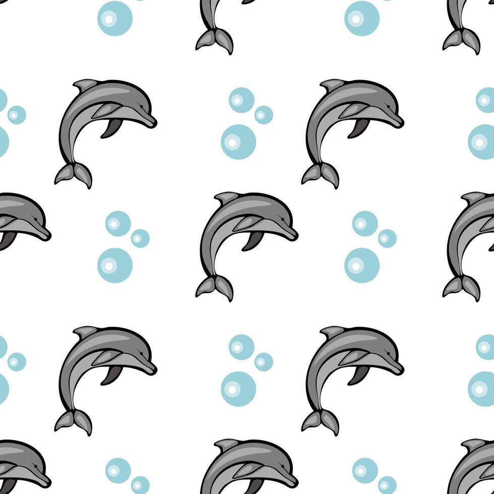 A playful pattern featuring cartoon dolphins and bubbles on a white background. The dolphins are gray with a simple, cheerful design, while the bubbles are light blue. Pro Vector