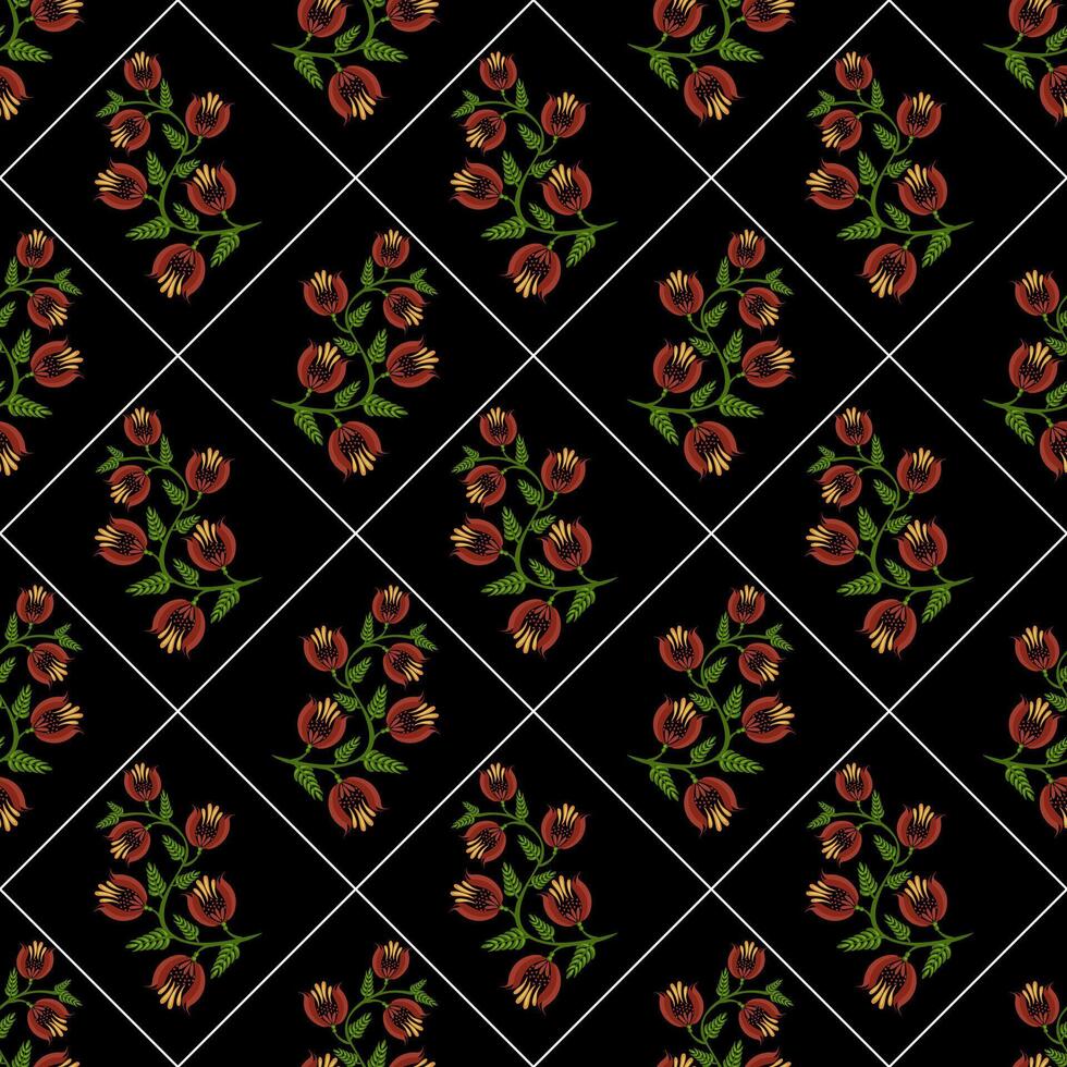 A seamless folk art pattern featuring stylized red tulips and green leaves on a black background, arranged in a diamond grid layout. Pro Vector