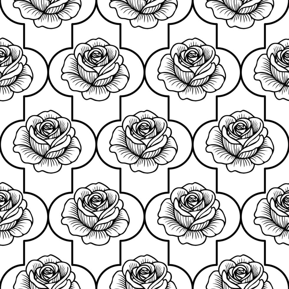 A seamless pattern featuring intricately drawn black roses on a white background, arranged in a geometric layout with decorative shapes. Pro Vector