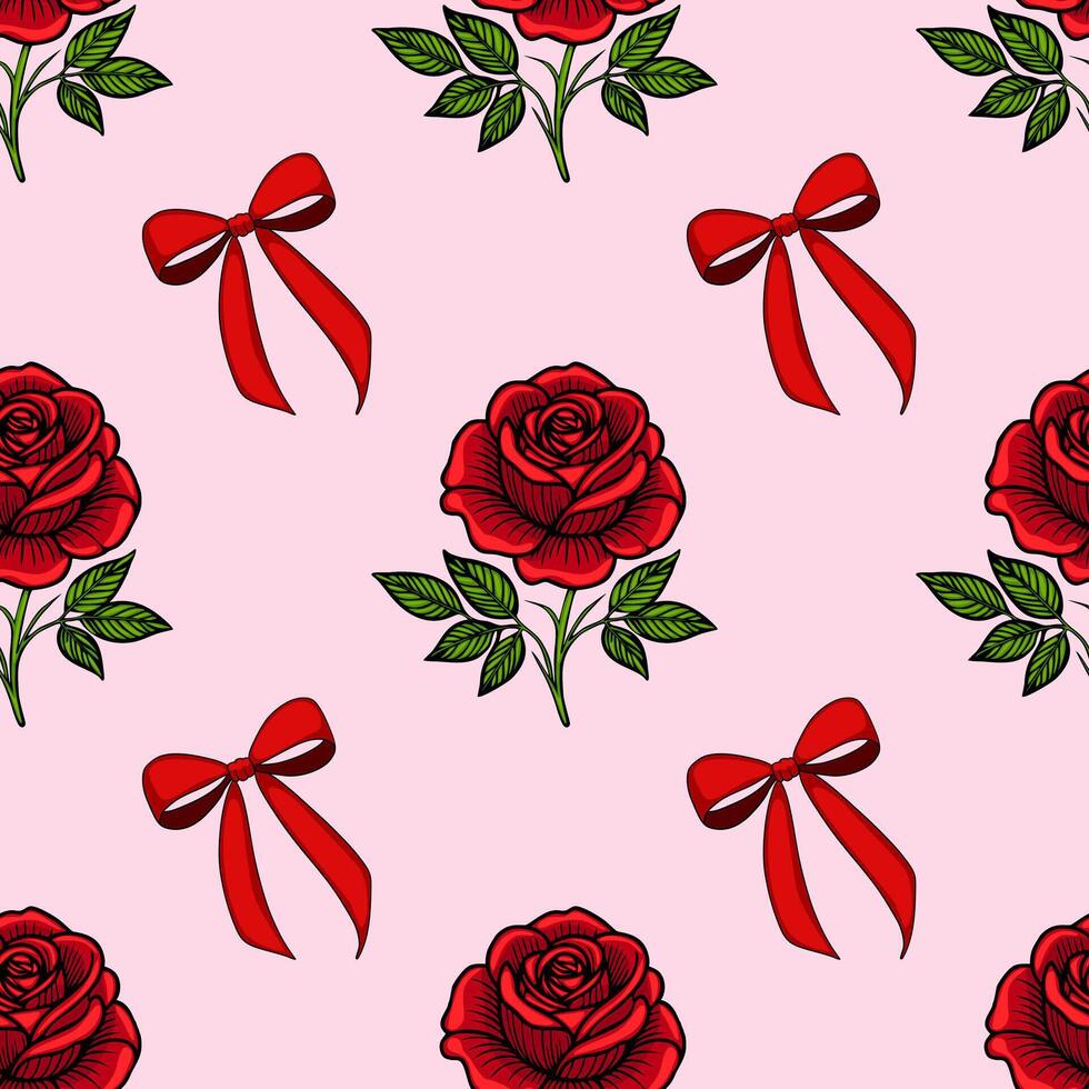 A seamless pattern featuring red roses and red bows on a soft pink background. The roses are detailed with green leaves, creating a romantic and cheerful design. Pro Vector