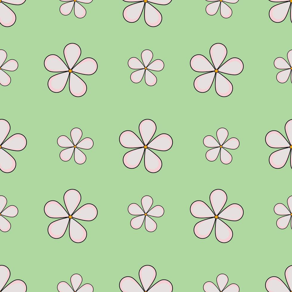 A seamless pattern featuring stylized pink flowers with black outlines on a light green background. The flowers vary in size and are evenly spaced, creating a cheerful and playful design. Pro Vector