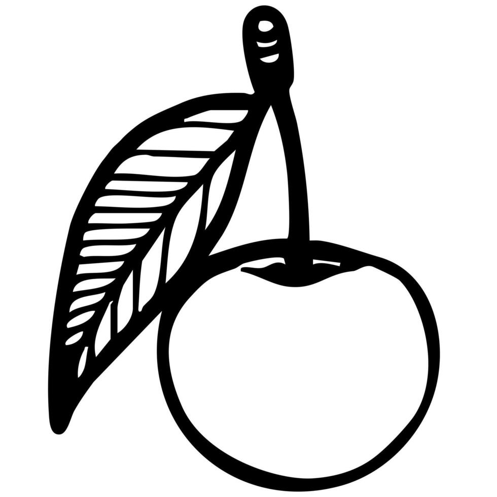 A simple black and white illustration of a cherry with a leaf. The cherry is round and smooth, with a single leaf attached to its stem, showcasing a minimalist design. Pro Vector
