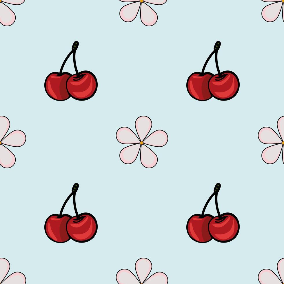 A repeating pattern featuring red cherries and light pink flowers on a soft blue background. The cherries are depicted in pairs with a black stem, while the flowers are simple and stylized. Pro Vector