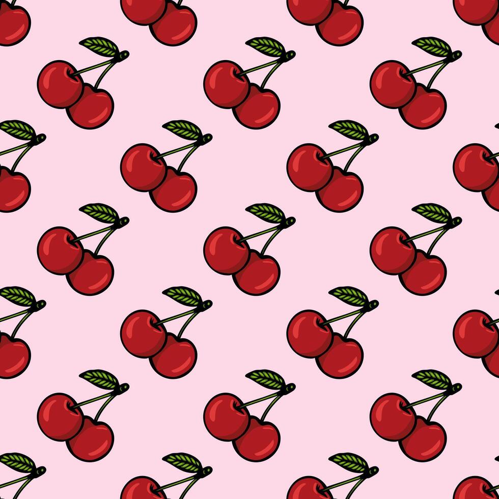 A seamless pattern featuring bright red cherries with green leaves on a soft pink background. The cherries are illustrated in a playful, cartoonish style, creating a vibrant design. Pro Vector