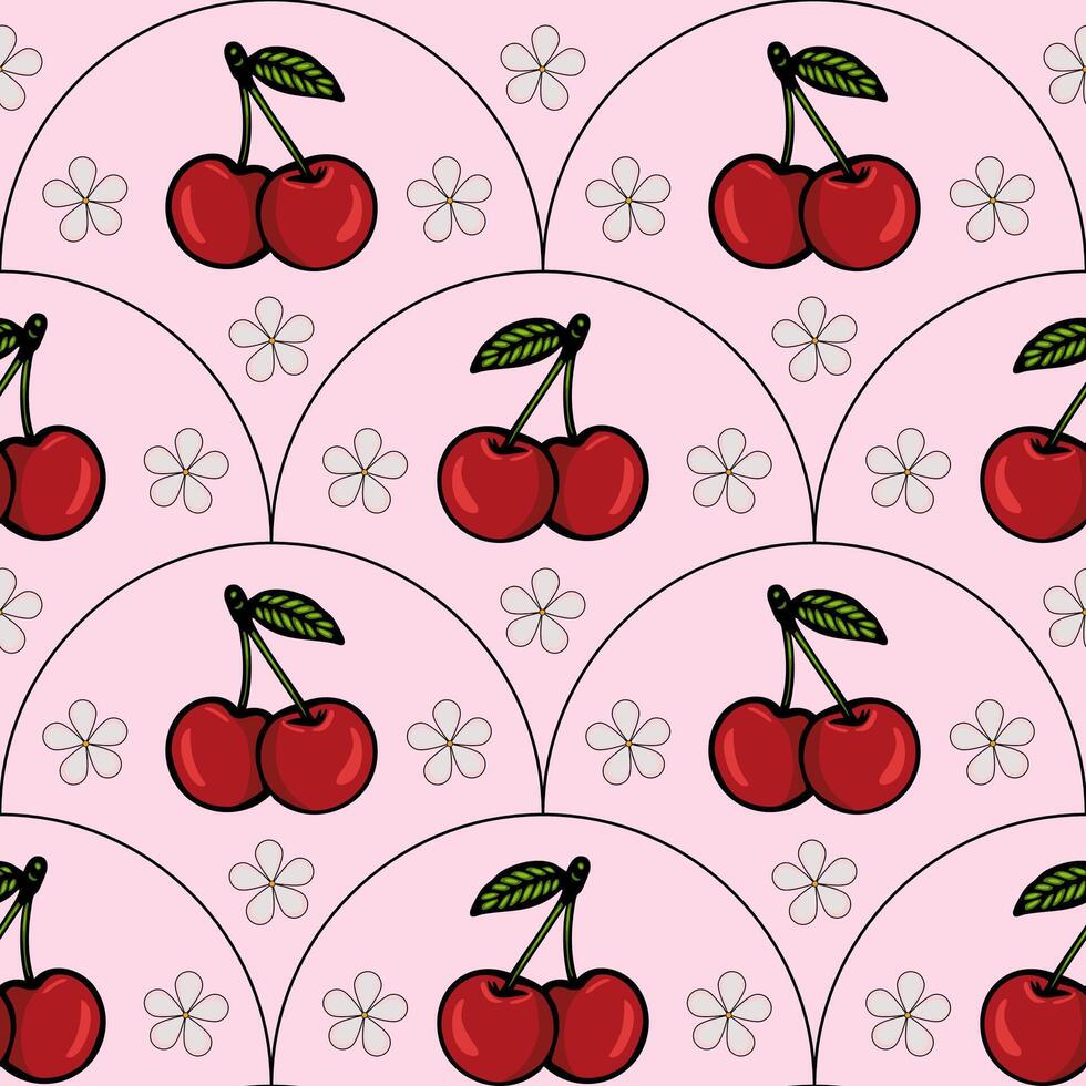 A repeating pattern featuring red cherries with green leaves on a soft pink background, interspersed with small white flowers. Pro Vector