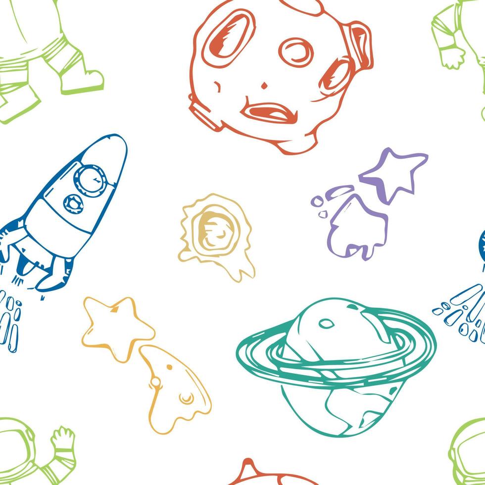Space seamless pattern print design for kids with cosmic elements, rockets, tars, planets, spaceships. design for fashion fabrics, textile graphics, prints. Hand drawn solar system. Pro Vector