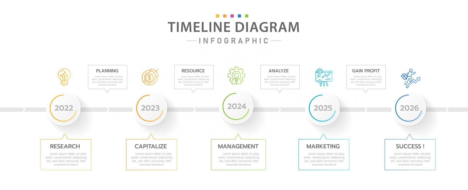 Infographic template for business. 5 Steps Modern Timeline diagram with planning topics, presentation vector infographic. Pro Vector