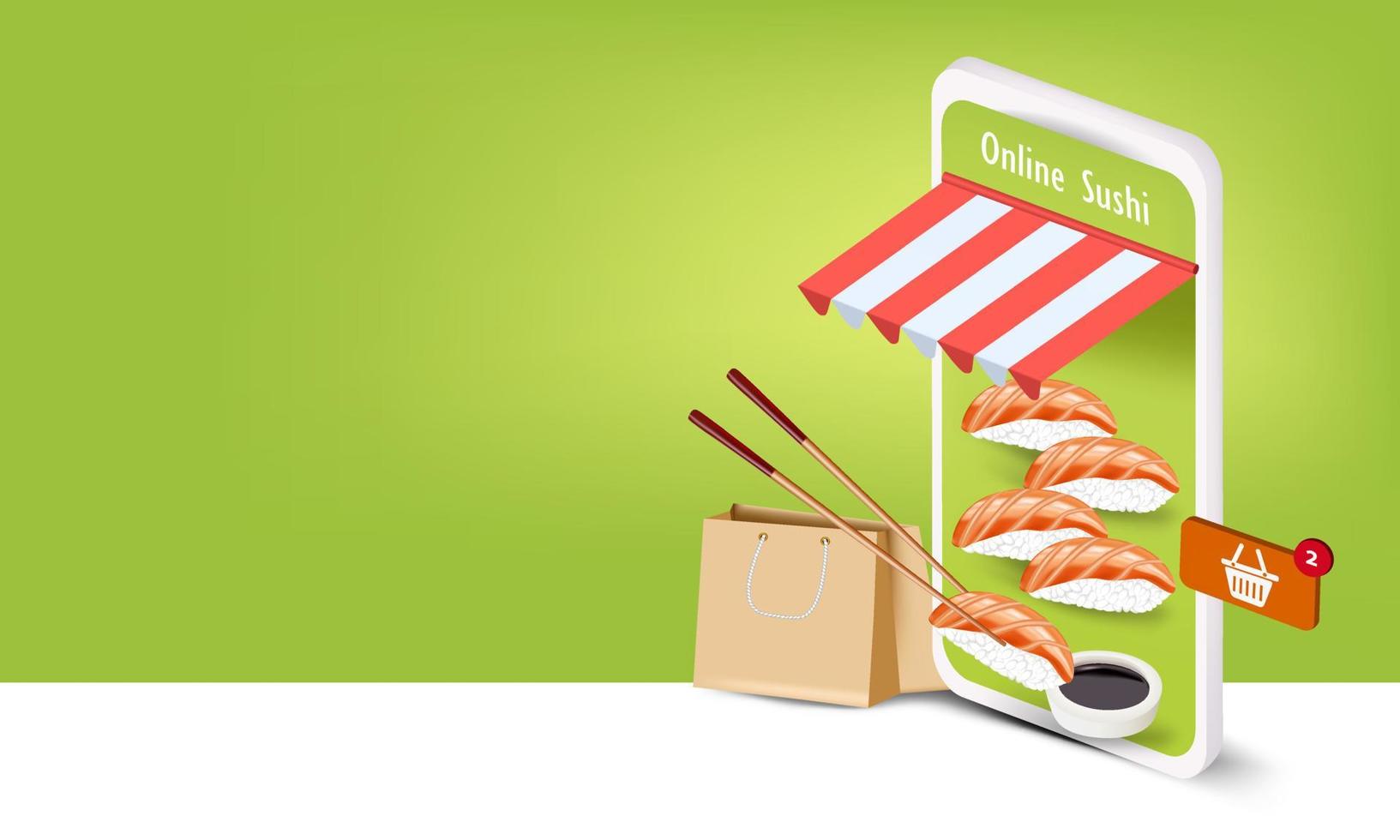Sushi with sauce and chopsticks in the smartphone application for online sushi order Pro Vector