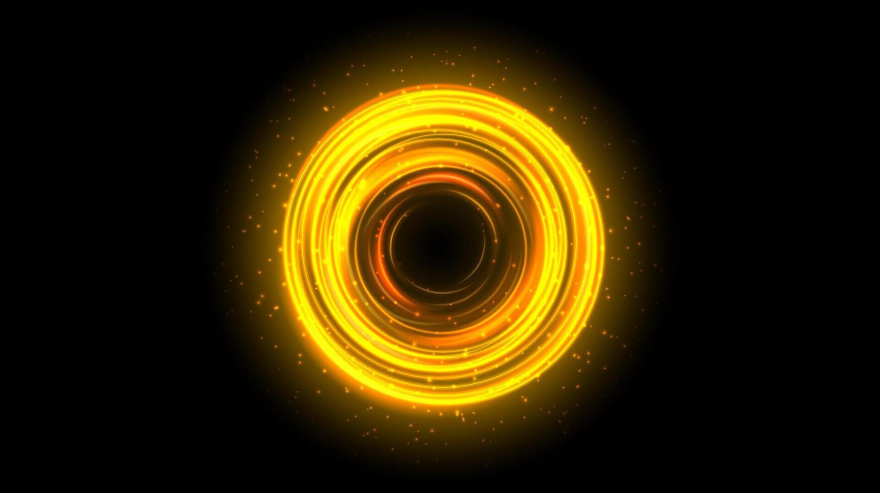 Yellow glowing portal concept. Neon hologram teleport gate on black background. Gold circle swirl aura with beams and sparks. Round hot flare template for game, ui, interface. Pro Vector