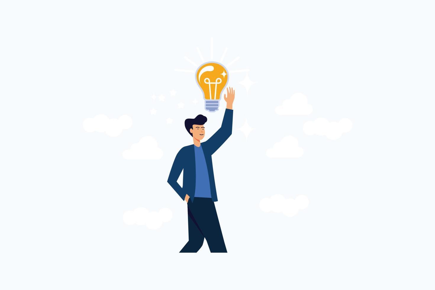 Positive thinking, optimistic mindset or good attitude to success in work, always get idea to solve any problems concept, happy businessman holding smiling lightbulb idea with positive vibes around. Pro Vector