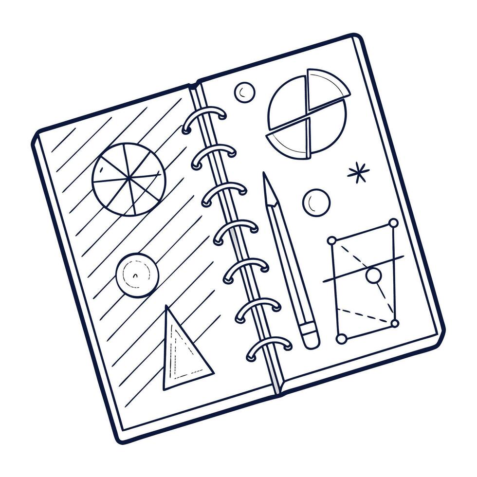 Open spiral notebook with pencil showing geometric sketches and diagrams in simple line drawing style Pro Vector
