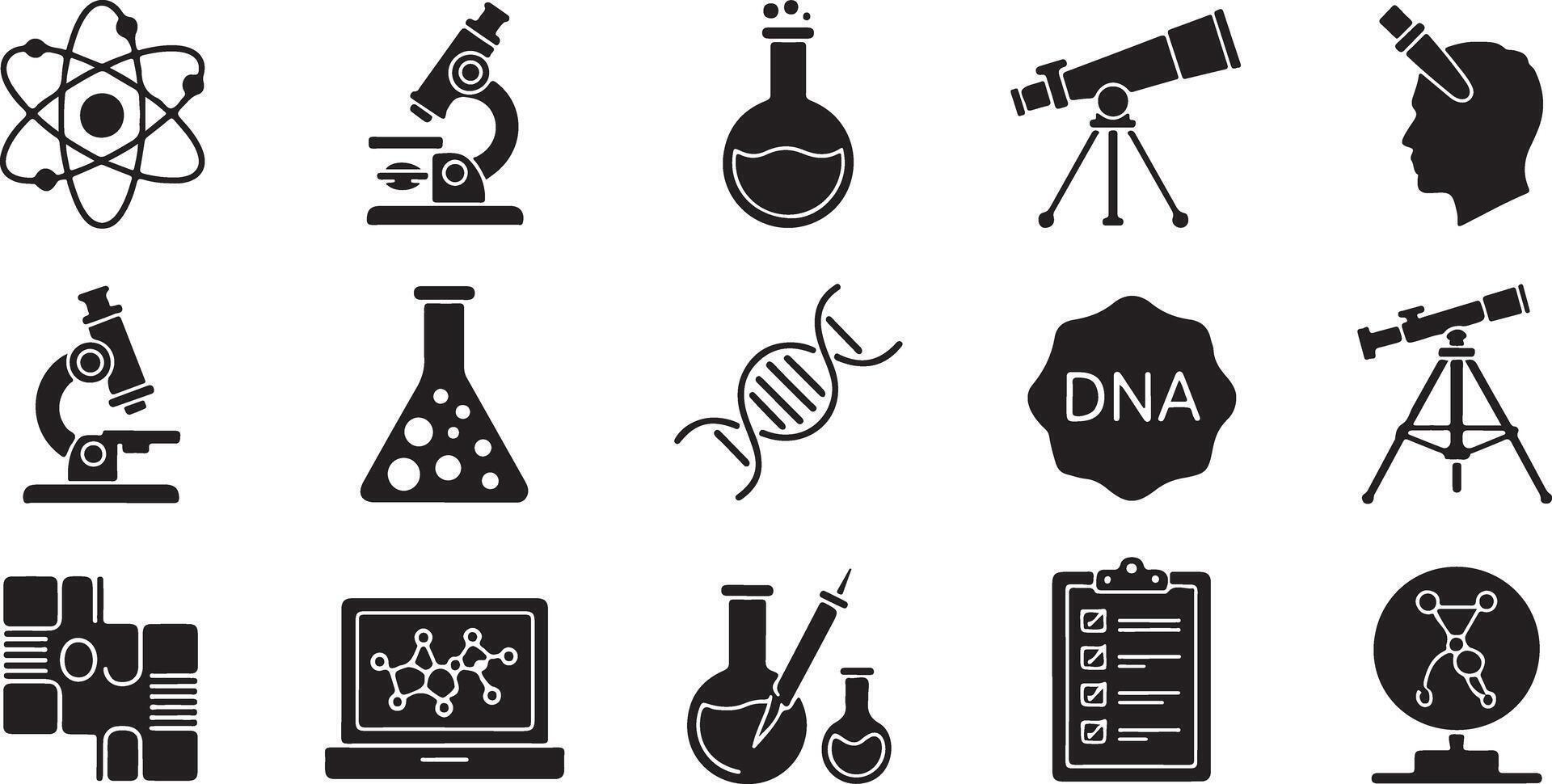 Black Glyph Icon Set Depicting Science and Education Concepts Including Microscopes Telescopes Erlenmeyer Flasks D N A Strands Atom Models and a Checklist Pro Vector