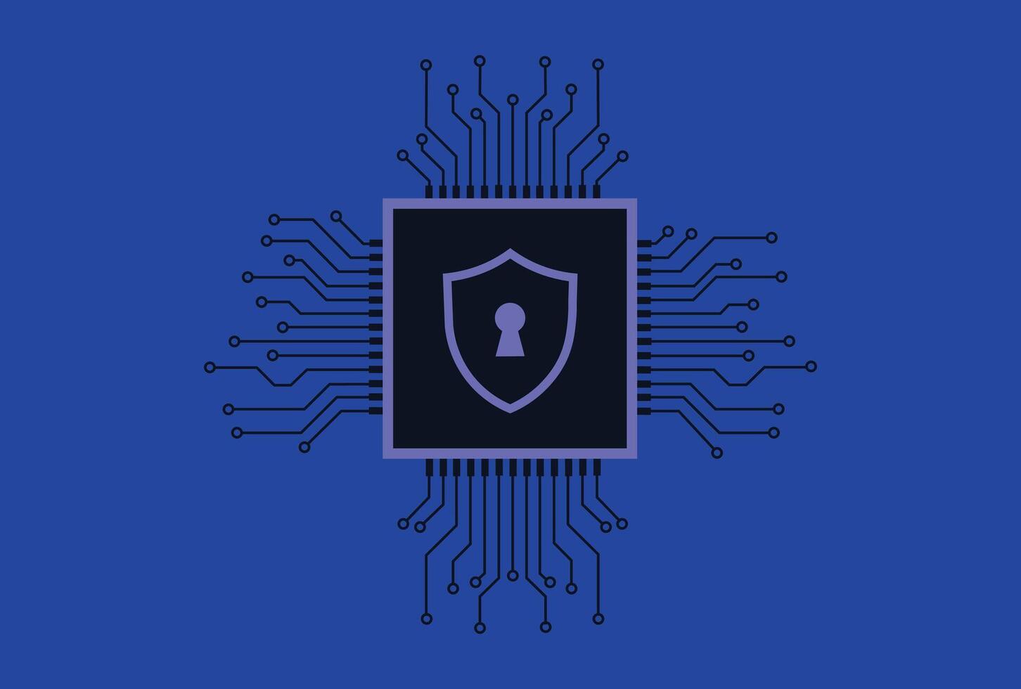 Flat of a high tech cybersecurity shield with a keyhole, set on a dark, simplified circuit board. Pro Vector