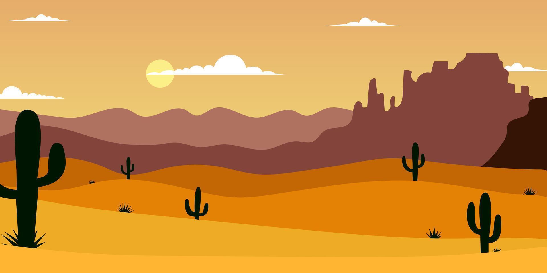 Sunset over desert landscape with cacti and distant mountains creating a serene atmosphere Free Vector
