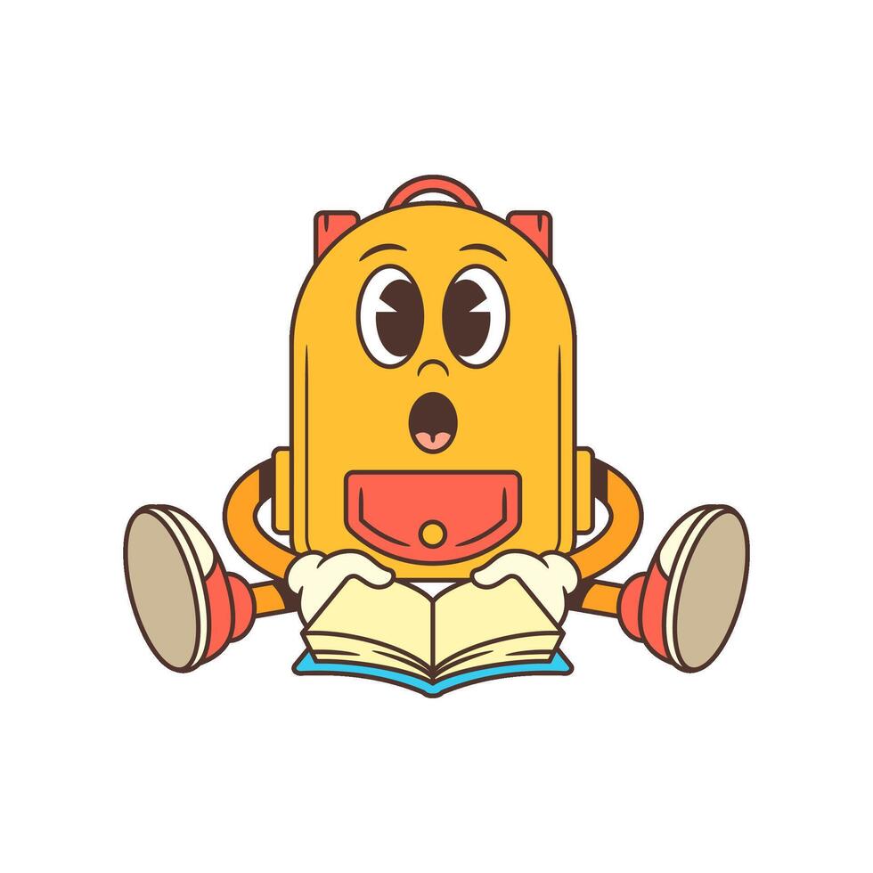 Curious Backpack Mascot Sitting with Open Book Showing Engagement in Reading and Learning Illustration Pro Vector