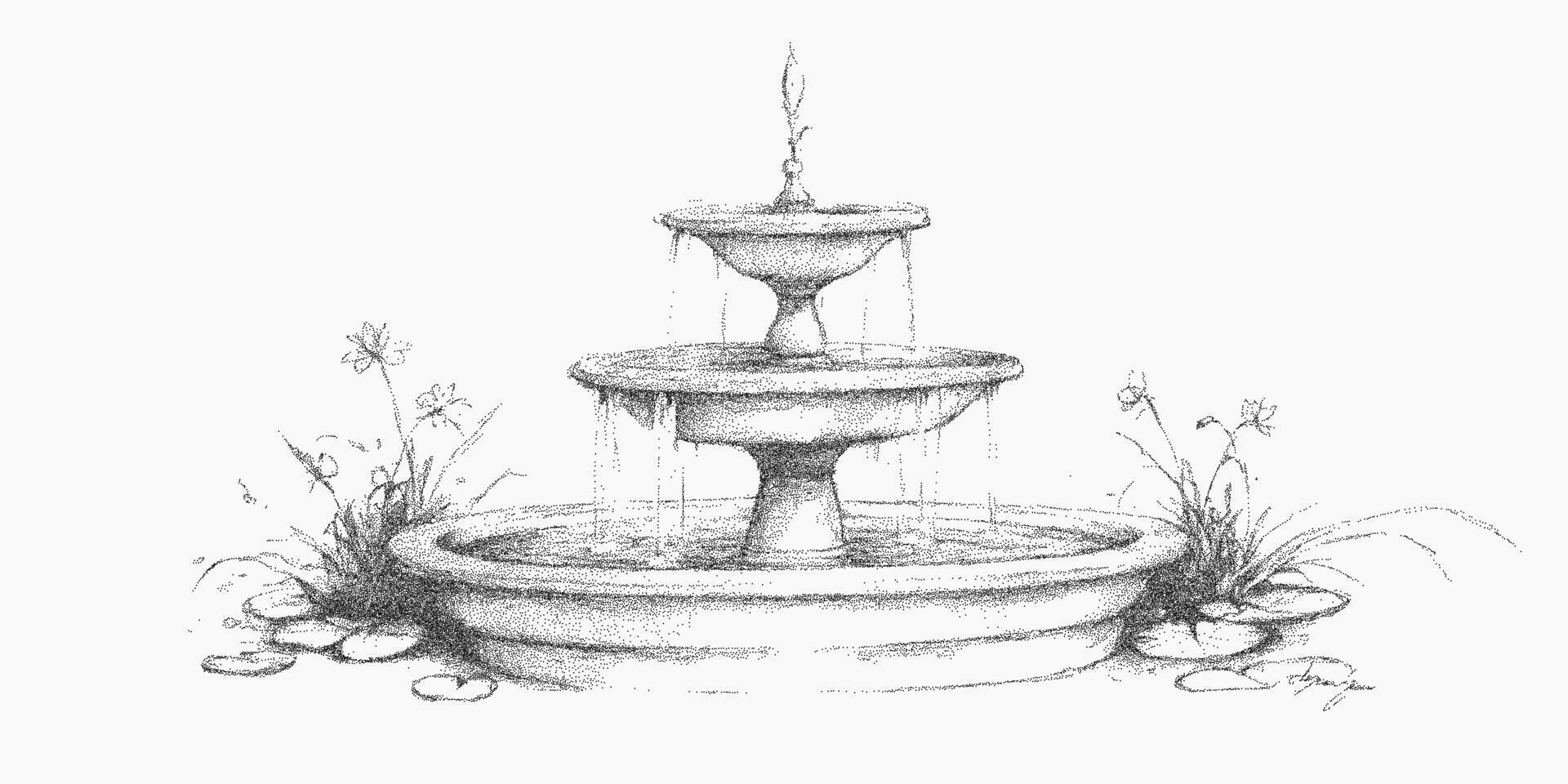 Fountain surrounded by grass and plants. Monochrome stippled piece with halftone pattern, noisy xerox texture and photocopy threshold for nostalgic feel. Pro Vector