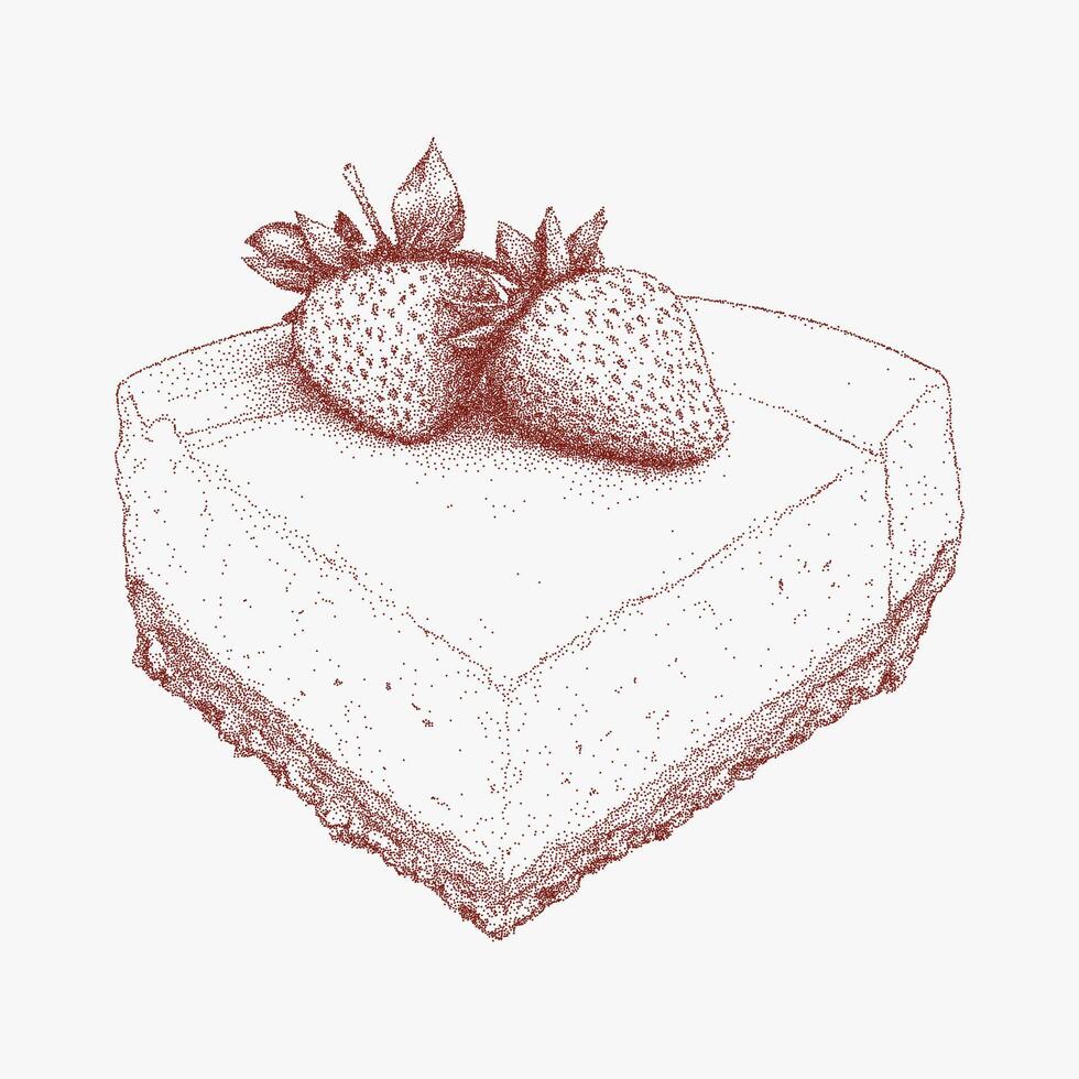Strawberry cake with two strawberries on top. Stipple sketch with bold halftone pattern, rough photocopy noise and threshold for lofi punk aesthetics. Pro Vector