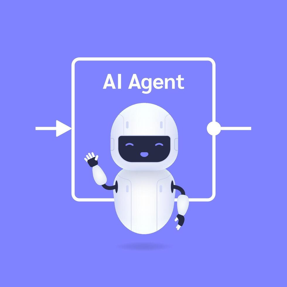 Robot cartoon character waving hello with Artificial Intelligence agent workflow design, representing advanced technology and automation illustration. Pro Vector
