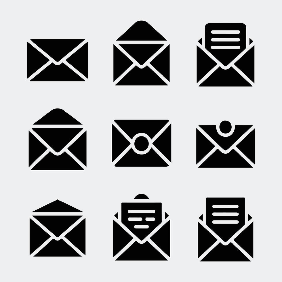 Set of Solid Black Icons Featuring Different Email Envelope Styles Pro Vector