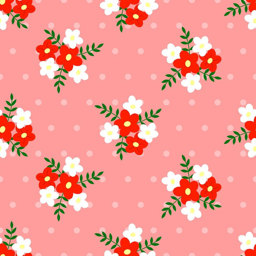 Seamless retro pattern of different compositions of flat flowers on a delicate pastel dotted background Pro Vector