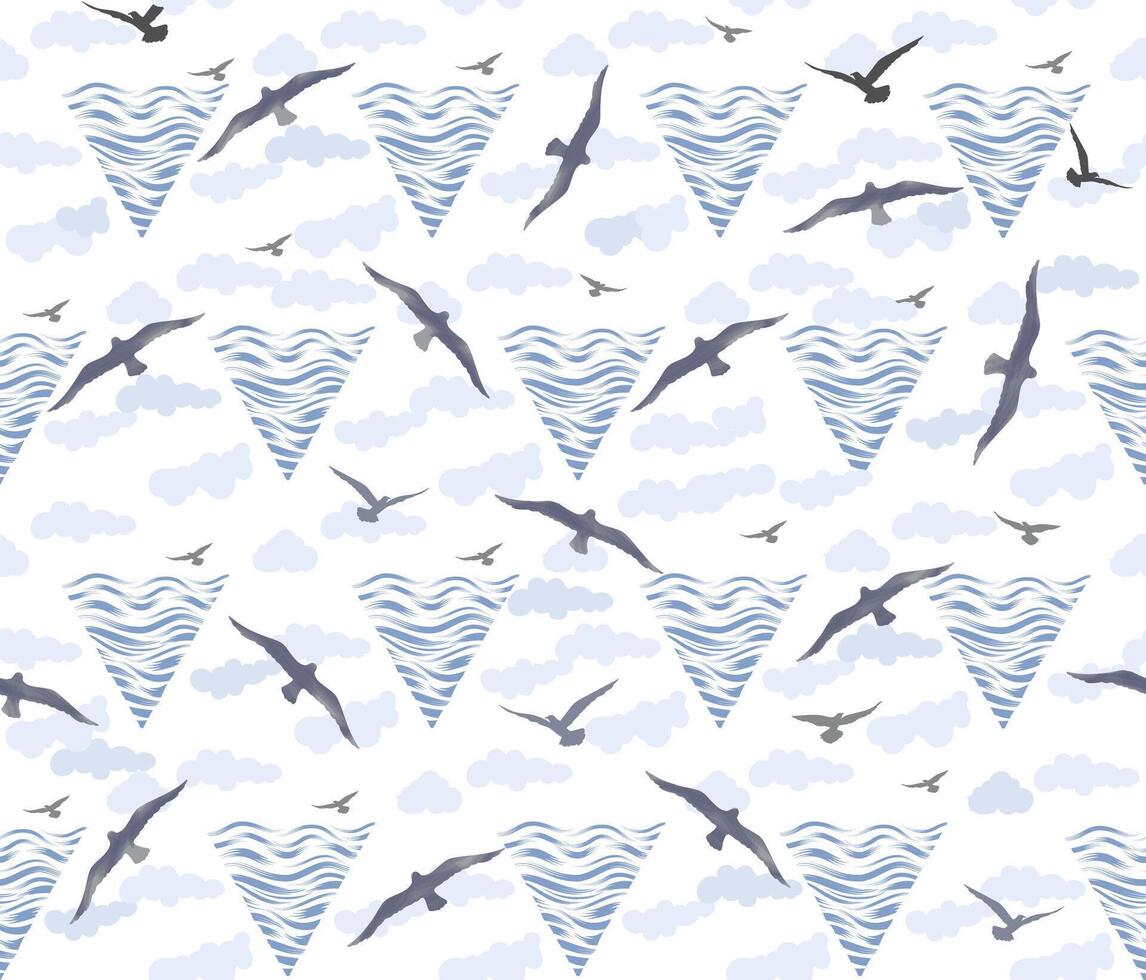 Seamless pattern with birds flying in the sky with clouds over waves. Nature sea view ornamental line drawn background Pro Vector