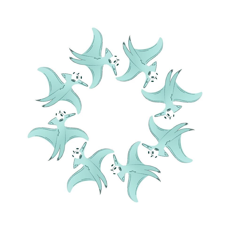 A circular composition of stylized ptirodactyls in light blue. The dinosaurs have a simplified design and are evenly distributed, creating a harmonious pattern. Pro Vector