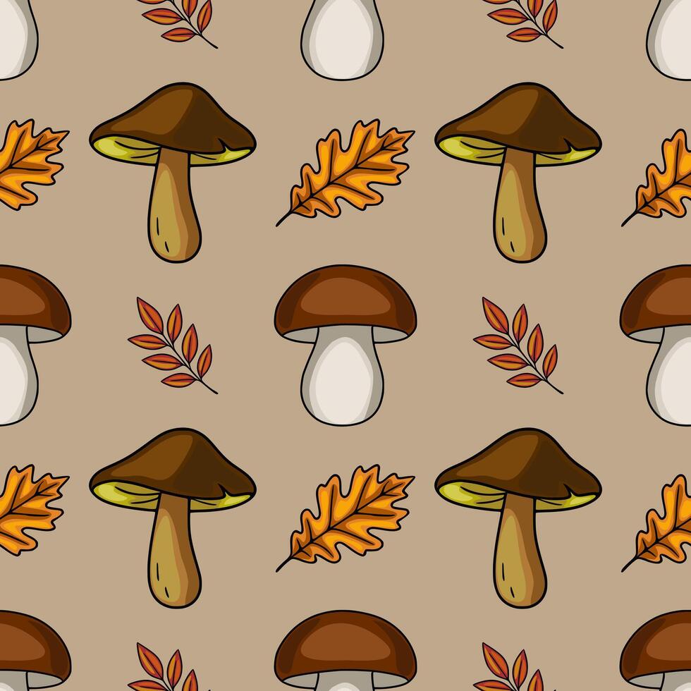 Seamless pattern featuring hand-drawn illustrations of brown mushrooms, oak leaves, and autumnal branches on a taupe background, creating a charming autumnal design. Pro Vector