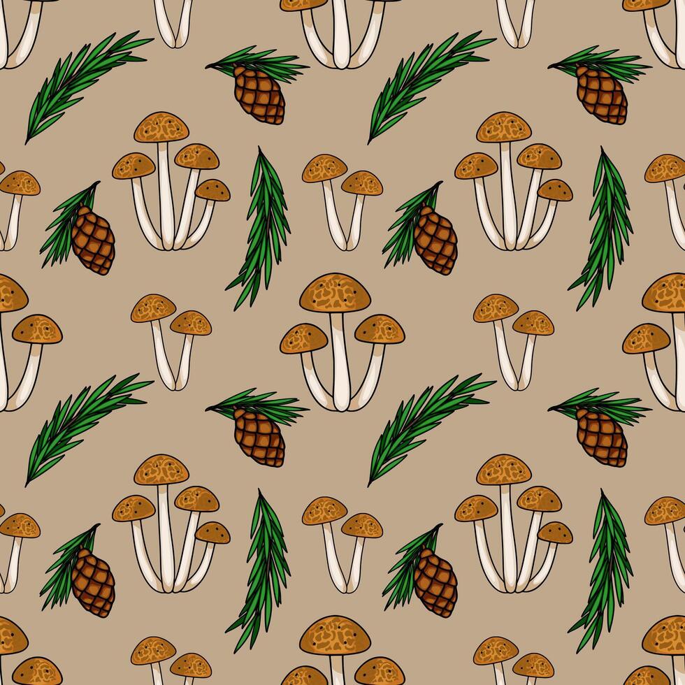 Seamless pattern featuring clusters of brown mushrooms, pine cones, and fir branches on a beige background, creating a charming autumnal forest illustration. Pro Vector
