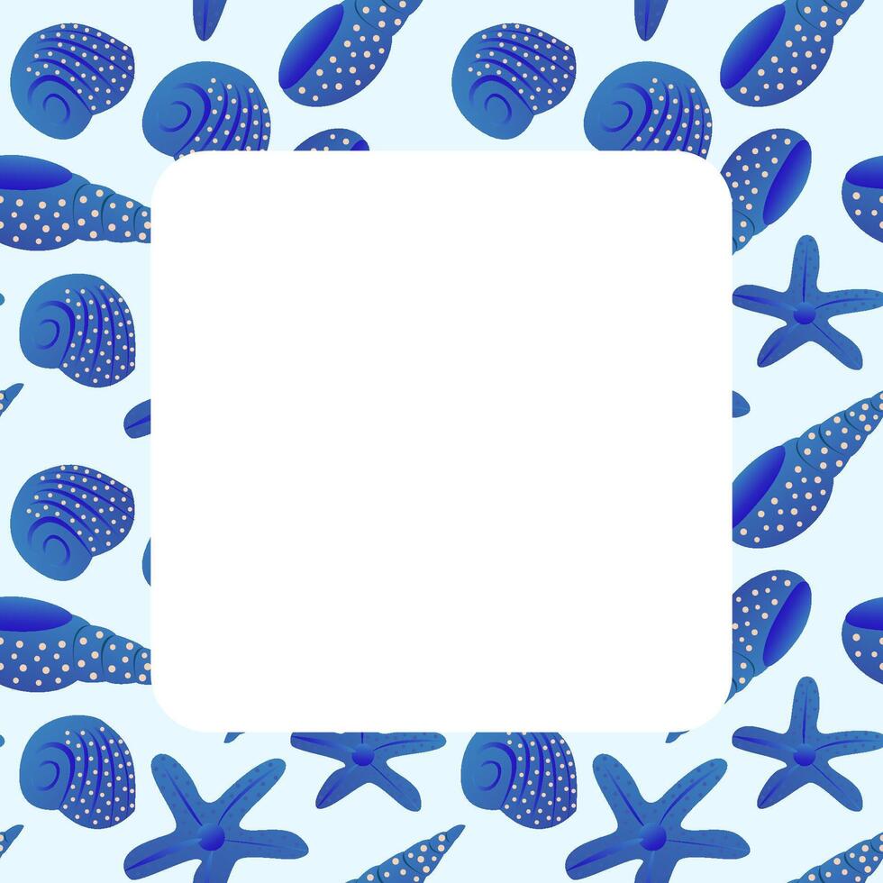 Seashells and starfish create a vibrant blue border around a blank square for creative use Pro Vector