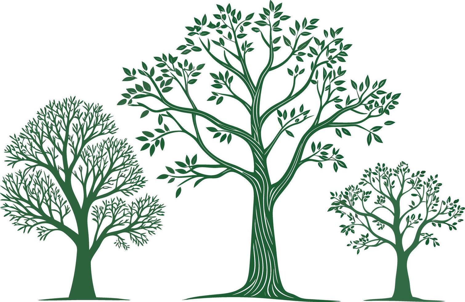 Three green trees with various branch shapes and leaf patterns Pro Vector