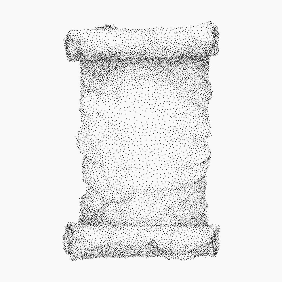 White scroll with black dots. Rough stipple shading with distressed halftone layers, old photocopy look and threshold outlines. Pro Vector